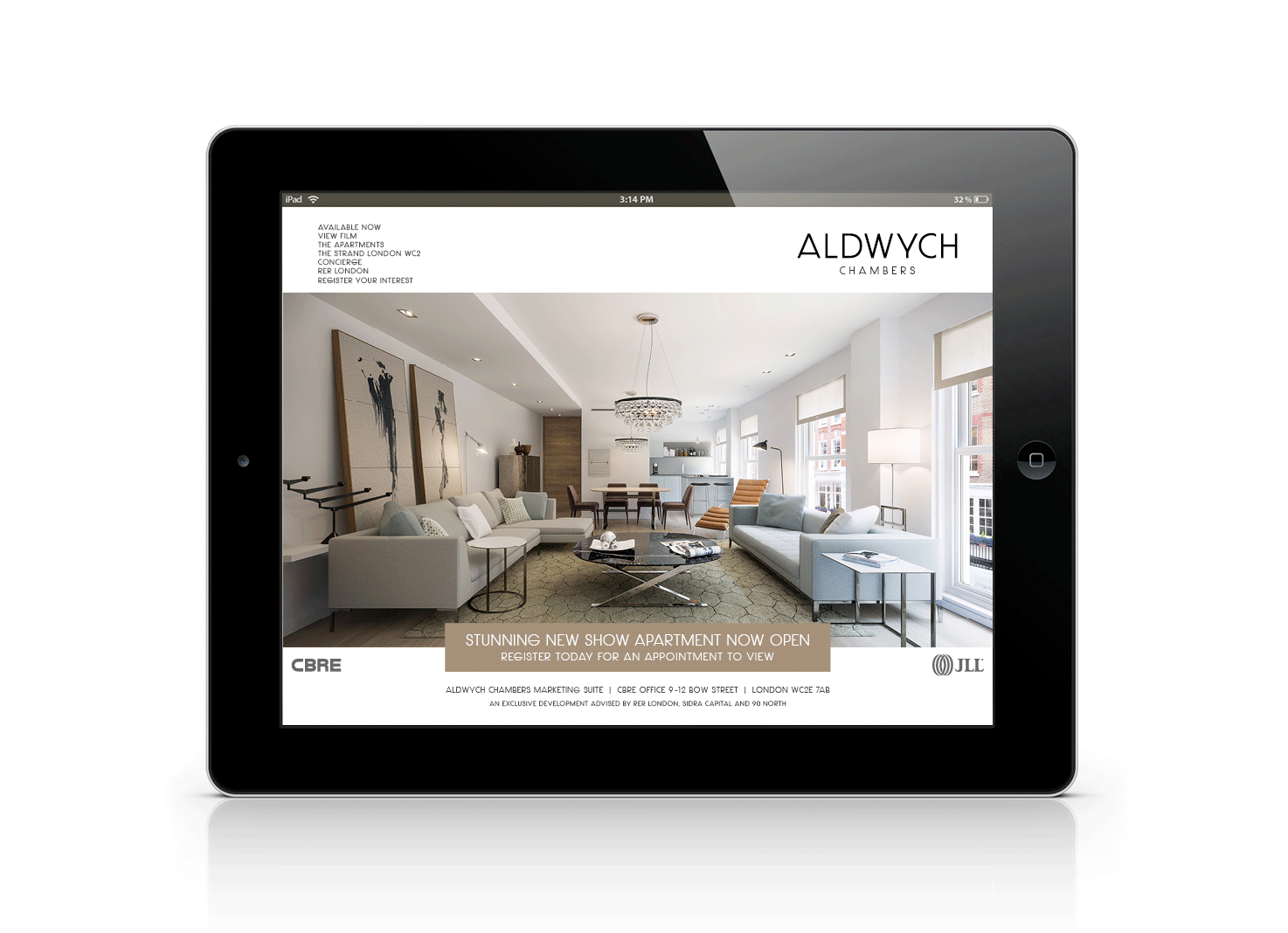 acquisition, investment and development company RER London. Scope of the project included naming and branding, casement cloth bound brochures, mini brochures, sales suite installation, press advertising campaign and ‘Brand Ambassador’ photography art direction, website and film.